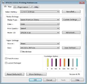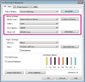 Для отображения наиболее часто используемых параметров вы можете настроить поля Select Setting, Media Type (Тип носителя) и Paper Size (Размер бумаги) следующим образом.
