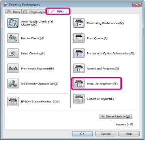 Щелкните вкладку Utility (Утилиты), затем щелкните кнопку Menu Arrangement.