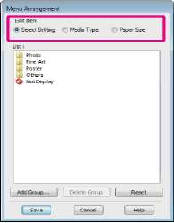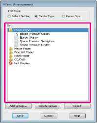 Вы можете перегруппировывать пункты, например, отображая элементы Select Setting (Выбор настройки), Media Type (Тип носителя) и Paper Size (Размер бумаги) в порядке, соответствующем интенсивности их использования.