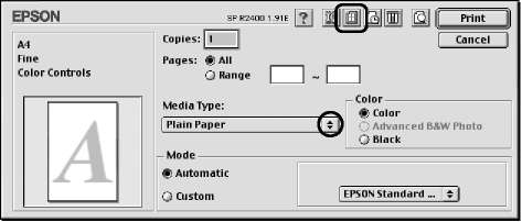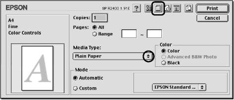 10. Выберите значения параметров Media Type (Тип носителя), Color (Цвет) и Mode (Режим).
