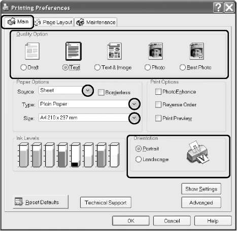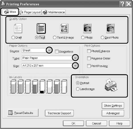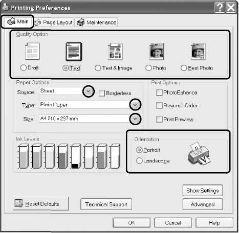 3. Выберите значения параметров Paper Size (Размер бумаги) и Orientation (Ориентация).
