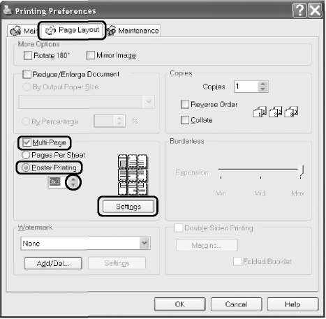 7. Перейдите на вкладку Page Layout (Макет), выберите параметр Multi-page, а затем Poster Printing (Печать плаката). Стрелками выберите значение 2x2,3x3 или 4x4.