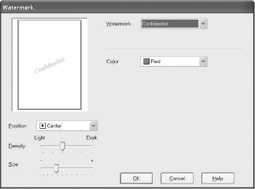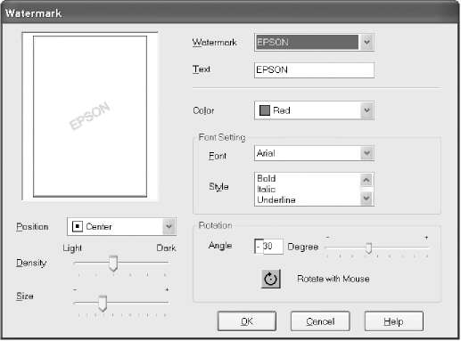 5. Убедитесь, что выбран нужный водяной знак в списке Watermark (Водяной знак), затем настройте параметры Color (Цвет), Position (Положение), Density (Интенсивность), Size (Размер), Font (Шрифт), Font Style (Стиль шрифта) и Angle (Угол). Изменения значений этих параметров отображаются на дисплее в левой части диалогового окна.