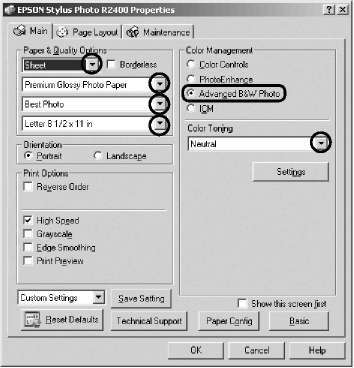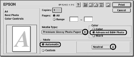 Режим Advanced B&W Photo (Улучшенное ч/б фото) доступен в зависимости от установленного картриджа Stylus Photo R2400 [Photo (Фото черный) или Matte Black (Матовый черный)], выбранного типа носителя и качества печати, список картриджей всех цветов по ссылкам - черного, голубого, пурпурного, желтого, светло-голубого, светло-пурпурного, серого, матово-черного, светло-серого. Есть возможность заказать оригинальные расходные материалы по ссылкам. Для большинства носителей выбирайте качество печати Best Photo (Наилучшее фото) или Photo RPM.