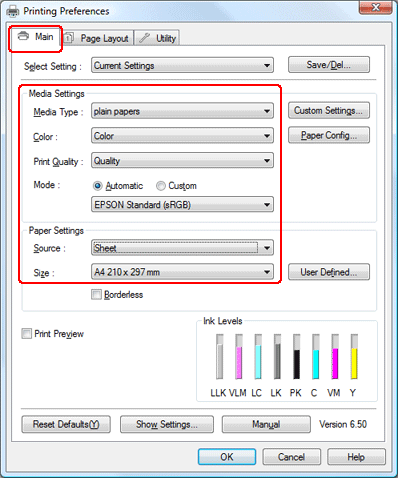 Щелкните вкладку Main (Главное), выберите подходящее значение параметра Media Type (Тип носителя), затем выберите предпочтительные значения параметров Color (Цвет), Print Quality и Mode (Режим). Доступность параметров может варьироваться в зависимости от выбранных настроек. Для параметра Source (Источник) выберите значение Sheet (Форматная бумага). Выберите подходящее значение параметра Size (Размер).