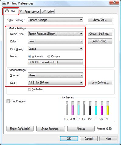 Щелкните вкладку Main (Главное), выберите подходящее значение параметра Media Type (Тип носителя), затем выберите предпочтительные значения параметров Color (Цвет), Print Quality (Качество печати будет лучше оригинальными расходными материалами) и Mode (Режим).