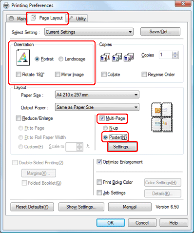 Щелкните вкладку Page Layout (Макет), выберите ориентацию отпечатка (Portrait (Книжная) или Landscape (Альбомная)), выберите флажок Multi-Page (Многостраничность) и затем Poster (Плакат).