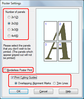 Установите флажок Borderless Poster Print (Печать плаката без полей), если необходимо печатать плакаты без перекрытия частей и последующей подрезки.