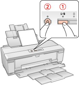 Удерживая кнопку бумаги, нажмите на кнопку питания, чтобы включить принтер.