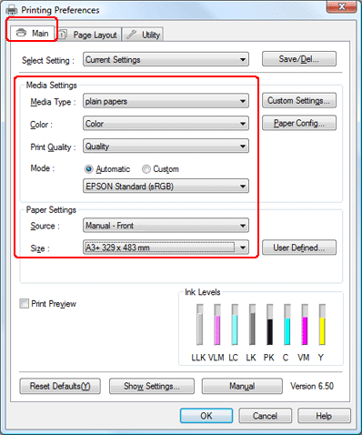 Щелкните вкладку Main (Главное), выберите подходящее значение параметра Media Type (Тип носителя и картриджа r2880) затем выберите предпочтительные значения параметров Color (Цвет), Print Quality (Качество печати и Mode (Режим). Доступность параметров может варьироваться в зависимости от выбранных настроек.