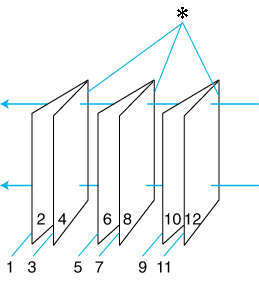 Двусторонняя печать в режиме Folded Booklet (Буклет) позволяет создавать буклеты из сложенных пополам листов. При создании буклетов сначала печатается сторона, которая окажется снаружи (после того, как буклет будет сложен). Страницы, которые попадут на внутреннюю часть буклета, распечатываются после повторной загрузки бумаги в принтер, как показано на иллюстрации ниже.