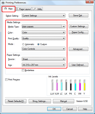 Щелкните вкладку Main (Главное), выберите подходящее значение параметра Media Type (Тип носителя), затем выберите предпочтительные значения параметров Color (Цвет), Print Quality (Качество печати) и Mode (Режим).