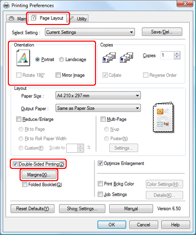 Щелкните вкладку Page Layout (Макет), выберите ориентацию отпечатка (Portrait (Книжная) или Landscape (Альбомная)) и затем установите флажок Double-Sided Printing (Двусторонняя печать).