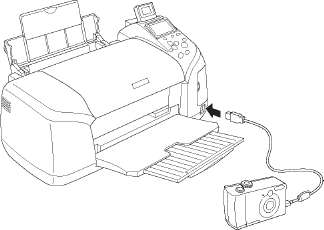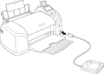 Принтер оснащен двумя разъемами USB, один на передней и один на тыльной стороне. USB5кабель можно подключить к любому разъему, но Epson рекомендует подключать цифровую камеру к правому разъему, а переносной или настольный компьютер — к левому разъему принтера.