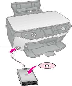 3. Подключите запоминающее устройство при помощи кабеля USB к разъему EXT I/F на передней стороне EPSON STYLUS PHOTO RX. (При использовании съемного диска подключите его напрямую.) Вставьте диск во внешнее записывающее устройство.
