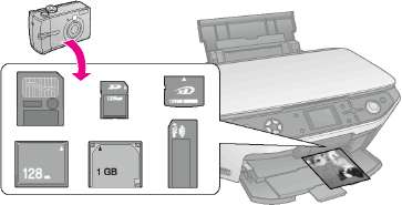 Вы можете напечатать фотографии с вашей цифровой камеры, вставив карту памяти со сделанными снимками. Если камера поддерживает стандарты PictBridge или USB DIRECT-PRINT, можно подключить камеру с помощю USB-кабеля.