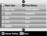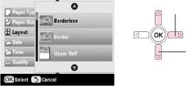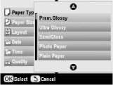 6. Выберите пункт Paper Type (Тип бумаги) и нажмите на кнопку r. Кнопками u и d выберите тип бумаги, как описано ниже, и нажмите на кнопку OK. Рекомендуем пользоваться оригинальным картриджем rx640.