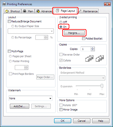 Перейдите на вкладку Page Layout (Макет), затем для двусторонней печати (2-sided printing (двусторонняя)) выберите On (Вкл.) .