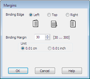 Для параметра Unit (Единицы измерения) выберите cm (см) или inch (дюймы). Затем укажите ширину переплета. Введите значение ширины переплета в диапазоне от 0,3 до 3,0 см (от 0,12 до 1,18 дюймов). Реальная ширина отступа для переплета зависит от настроек вашего приложения. Перед печатью всего задания поэкспериментируйте, распечатав несколько листов.