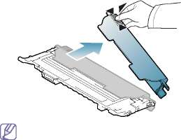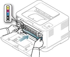 8. Цвет тонера должен соответствовать цвету маркировки паза. Возьмите его за ручки и вставьте его в принтер до щелчка.