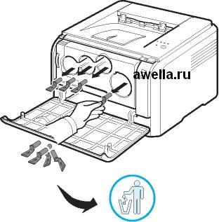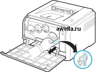 При необходимости положить принтер набок или перевернуть его, снимите контейнер для сбора тонера и перемещайте его отдельно от принтера. В противном случае можно загрязнить внутренние части принтера.
