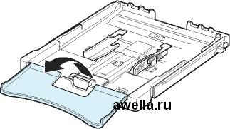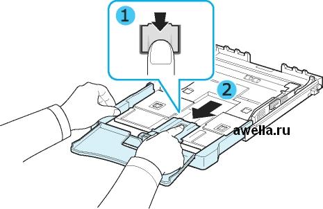 2 Нажав и освободив защелку ограничителя в верхней части лотка, раздвиньте лоток вручную.