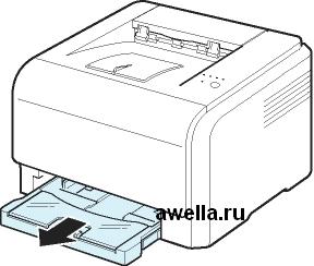 1 Выдвиньте лоток из принтера. Откройте крышку и при необходимости извлеките бумагу из лотка.
