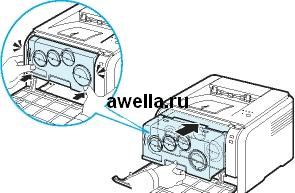 8 Возьмите их и установите их в слоты внутри принтера. Вставляйте в соответствующие слоты до щелчка.
