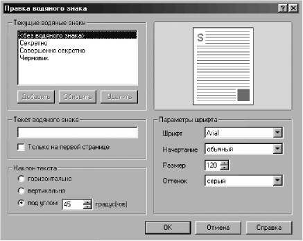Водяные знаки позволяют печатать текст поверх существующего документа. Например, можно напечатать текст «Черновик» или «Секретно» большими серыми буквами по диагонали на первой или на всех страницах документа.