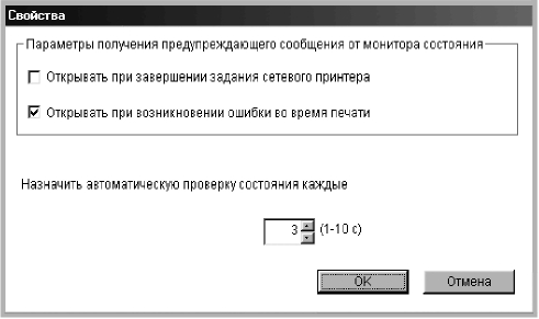 • «Назначить автоматическую проверку состояния каждые»: позволяет регулярно обновлять информацию о состоянии принтера. Чем меньше значение данного параметра, тем чаще компьютер проверяет состояние принтера, что позволяет быстрее реагировать на ошибки.
