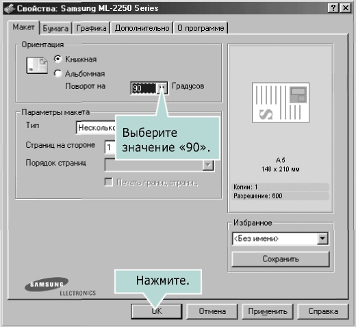 2 Откройте окно «Свойства: Samsung ML-2250 Series» и установите размер бумаги A5 (148х210 мм) на вкладке «Бумага».