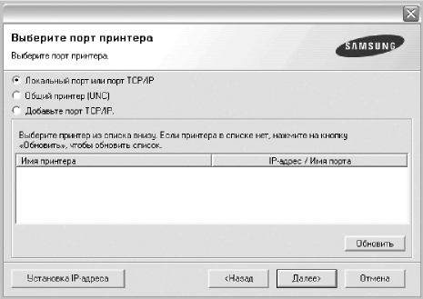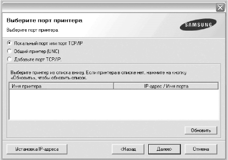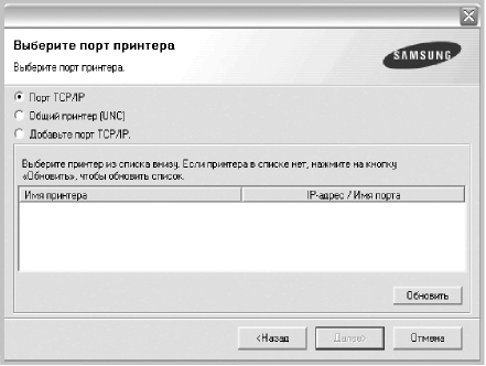 • Если нужный принтер в списке отсутствует, нажмите кнопку Обновить, чтобы обновить список, или выберите Порт TCP/IP, чтобы добавить ваш принтер к сетевымм. Чтобы добавить принтер к сетевымм, введите имя порта и IP-адрес.