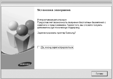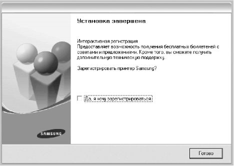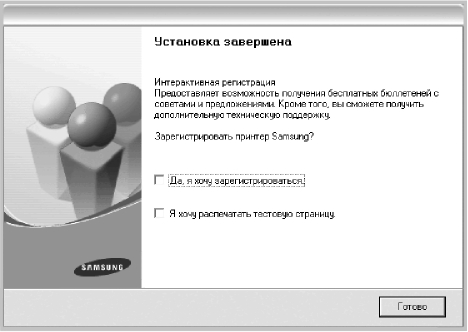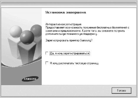 По завершении установки появится окно с предложением напечатать тестовую страницу и зарегистрироваться в качестве пользователя Samsung, чтобы получать сообщения от компании Samsung. Установите соответствующие флажки по своему усмотрению и нажмите кнопку Готово.