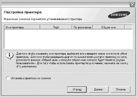 Выберите компоненты, которые следует установить. После выбора компонентов появится следующее окно. Можно также изменить имя, разрешить общий доступ к принтеру в сети, назначить принтер в качестве используемого по умолчанию, а также изменить имя порта для каждого. Нажмите кнопку Далее.