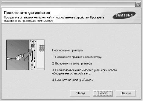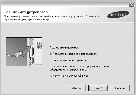 • Подключите принтер и нажмите кнопку Далее.