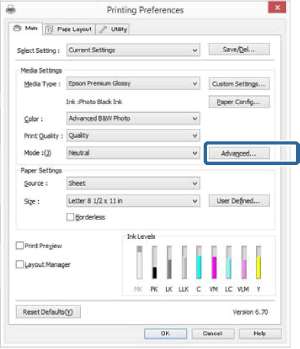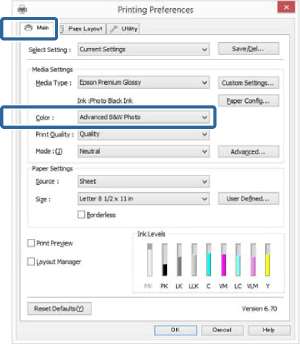 Перейдите на вкладку Main (Главное) драйвера принтера и для параметра Color (Цветной) выберите Advanced B&W Photo (Расширенное ЧБ фото).