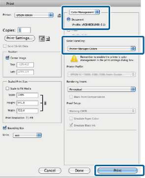 Выберите Color Management (Управления цветом) и затем Document (Документ). В поле Color Handling (Обработка цветов) выберите Printer Manages Colors (Принтер выполняет управление цветом) и щелкните кнопку Print (Печать).