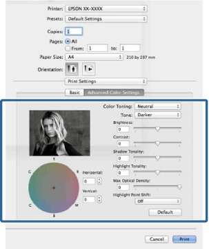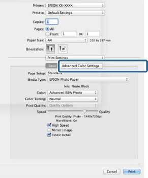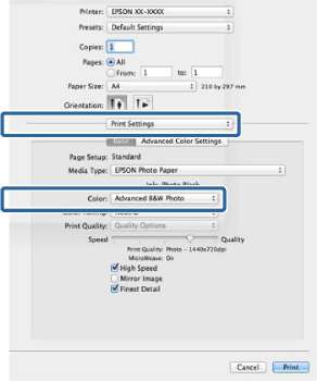 Вызовите диалоговое окно Print (Печать), из списка выберите Print Settings (Настройки печати) и затем для параметра Color (Цветной) выберите Advanced B&W Photo (Расширенное ЧБ фото).