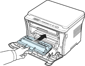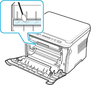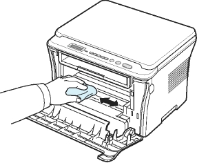 3 Сухой тканью без ворса протрите место установки, чтобы удалить частицы пыли и тонера из полости.