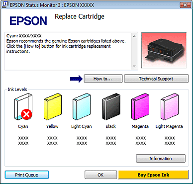 Когда чернила заканчиваются или полностью израсходованы, появляется кнопка How to (Как сделать). Щелкните кнопку How to (Как сделать) и выполняйте пошаговые инструкции EPSON Status Monitor 3 по замене картриджа.