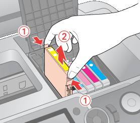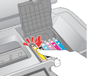 Если он вынимается с трудом, сильнее потяните строго вверх. Не заправляйте их. Продукты, произведенные не Epson, могут повредить ваш принтер, и эти повреждения не подпадают под гарантийные условия Epson. При определенных условиях они могут привести к неустойчивой работе принтера. Опустите его вертикально в гнездо. Нажмите на него, чтобы он защелкнулся на месте.