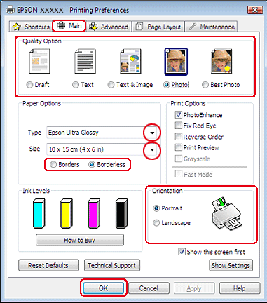 Установите флажок Borderless (Без полей) для печати без полей.