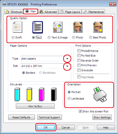 Откройте вкладку Main (Главное) и выберите один из рекомендуемых ниже параметров Quality Options (Качество печати).