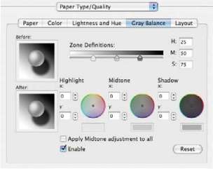 • В диалоговом окне Print (Печать) Mac OS (T1120): перейдите на панель Paper/Quality (Бумага/Качество), а затем — Gray balance (Баланс серого).