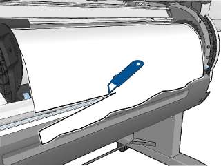 13. Для обрезки переднего края бумаги воспользуйтесь острым ножом, чтобы обрезать бумагу вдоль гнезда тормозного механизма подачи бумаги.