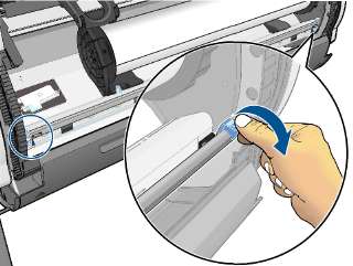 16. Закройте блокиратор подачи бумаги. Убедитесь, что край бумаги все еще находится в синей зоне.