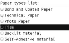 Если функция Печать сведений о бумаге включена, и на загруженном рулоне не обнаруживается штрих-код, на передней панели появится запрос на ввод типа бумаги длины загруженного рулона. Выберите категорию и тип используемой бумаги. Если вы не уверены, какую категорию или тип бумаги необходимо выбрать.