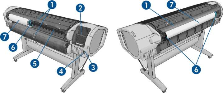 На следующих рисунках представлен вид принтера для печати на бумаге шириной 1118 мм спереди и сзади, а также отмечены его основные элементы. У принтера для печати на бумаге шириной 610 мм те же самые компоненты, но сам корпус уже.