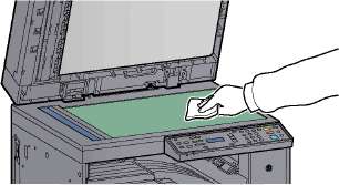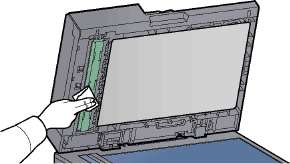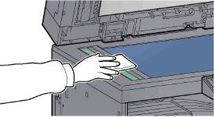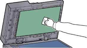 Протирайте обратную сторону крышки стекла экспонирования, внутреннюю сторону обработчика документов и поверхность стекла мягкой тканью, смоченной спиртом или нейтральным моющим средством.