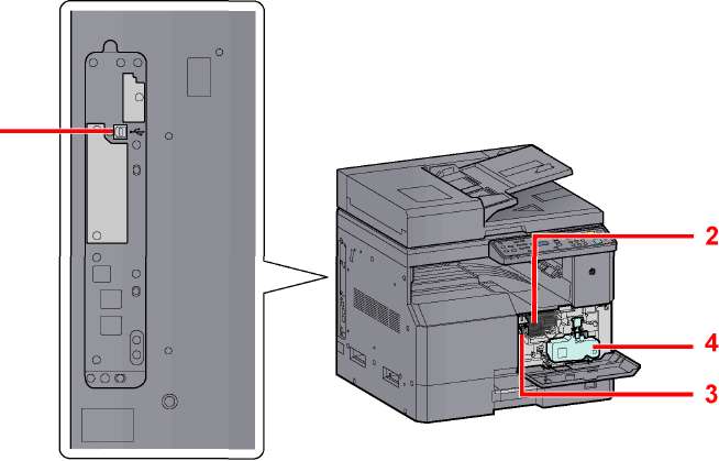 1 Подсоедините кабель USB к разъему интерфейса USB на левой стороне корпуса.